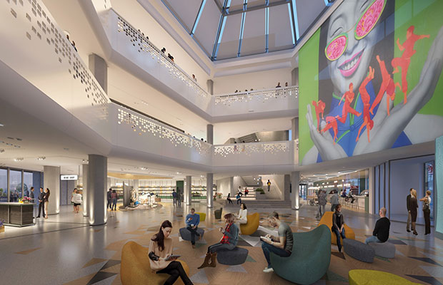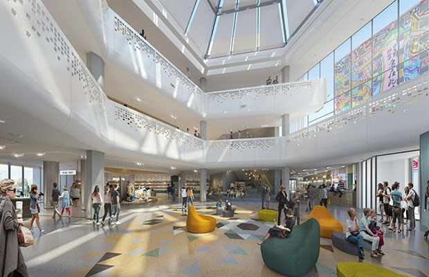 位于一层的六边形主中庭,除了兼具活动举办和休憩等功能外,来自中国顶级视觉创意团队带来 的多媒体投影故事秀每晚都将在这里上演,通过声光电的特效和三面从三楼倾垂而下长达 6米的纱幕,180°投影属于北京百姓生活的过去、现在、未来都将在 8 分钟里为大家极致呈现。